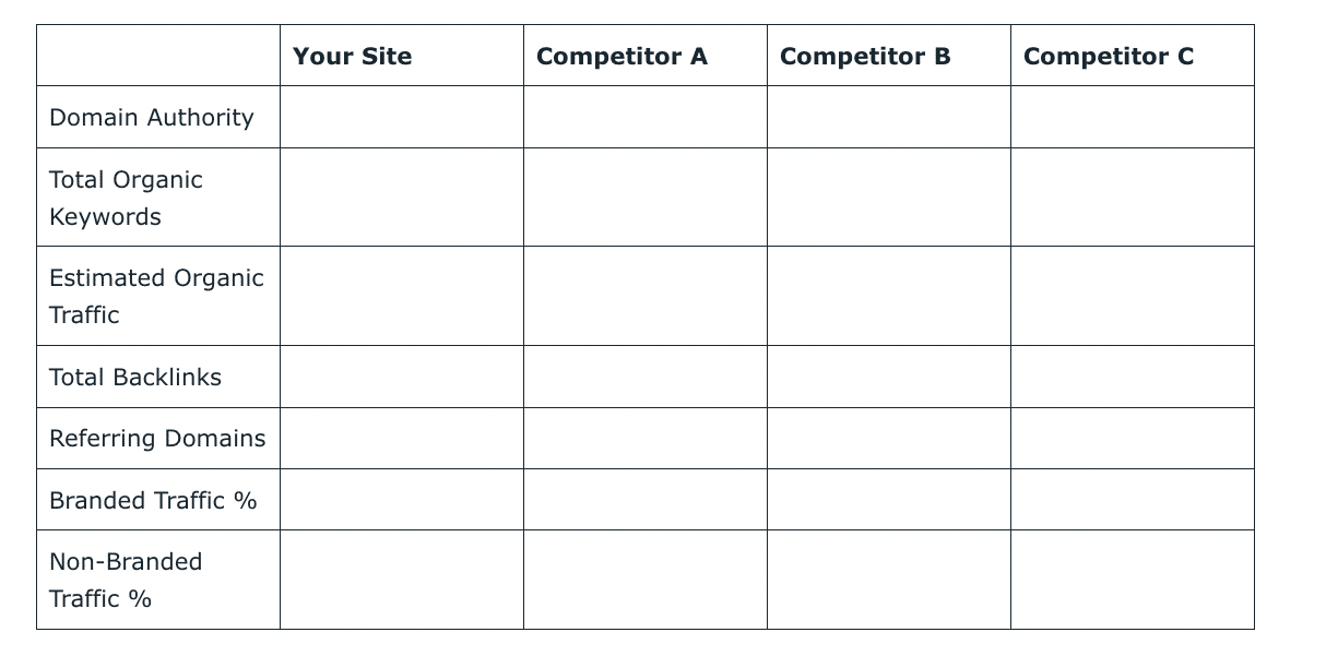 Once you've identified 5-10 primary competitors, create a competitive matrix comparing the major metrics: