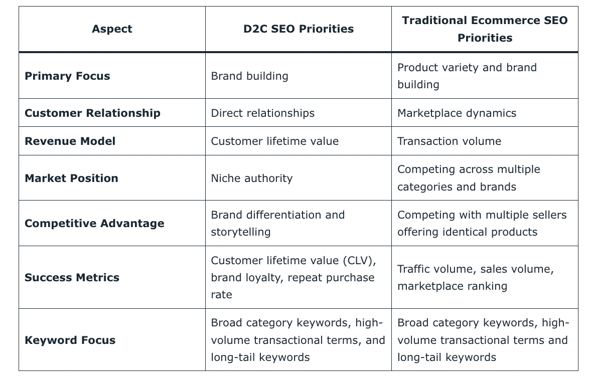 While both D2C and traditional ecommerce sites compete for search visibility, their strategic approaches differ significantly.